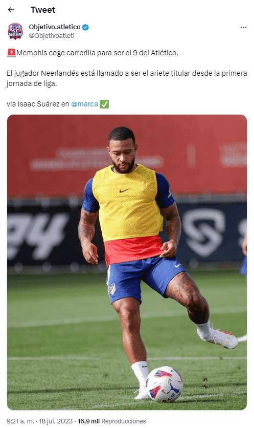 En este marco, la gran novedad para Diego Simeone es que Memphis Depay trabaja a la par de sus compañeros y para el entrenador será su delantero de área titular para arrancar la temporada, de acuerdo a la información de diario Marca. Tras un año irregular, ahora el neerlandés se prepara para ir por su revancha.