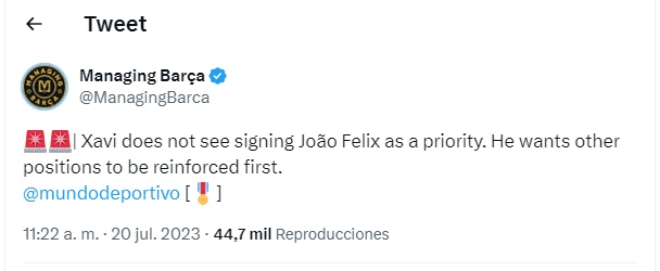 De acuerdo a la información que aporta Mundo Deportivo, Joao Félix está muy lejos de ser hoy una prioridad para Xavi Hernández. El motivo que esgrime el entrenador Culé es muy claro porque considera que necesita reforzarse antes en otras posiciones que en la de fichar jugadores que sean delanteros.