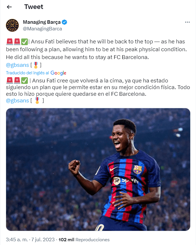De acuerdo a la información de Gabriel Sans especializado en Barca, Ansu Fati ha realizado un plan para mejorar su condición física de manera personal durante las vacaciones y está muy convencido de que volverá a ser el jugador de no hace mucho tiempo. Su objetivo será poder pelear por un lugar en la ofensiva blaugrana.