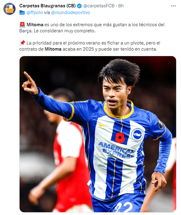Los ojeadores del cuadro catalán tienen sus ojos puestos en uno de los clubes revelación de la temporada europea, más específicamente en la Premier League, donde el Brighton sorprende a todos con su gran estilo de juego y competencia ante los equipos del famoso Big Six, allí la directiva ha puesto sus ojos sobre el futbolista japonés Kaoru Mitoma, quien ha tenido unos brillantes números con el equipo de las gaviotas, desde su llegada en 2021, 13 goles, 12 asistencias son un gran dato para los 52 partidos oficiales con el equipo inglés.