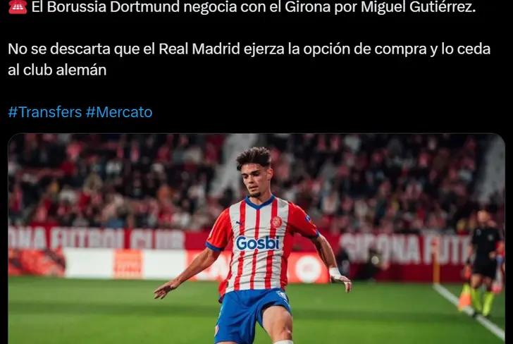 "El Borussia Dortmund negocia con el Girona por Miguel Gutiérrez. No se descarta que el Real Madrid ejerza la opción de compra y lo ceda al club alemán", explicó la fuente antes referida sobre el lateral izquierdo, quien actualmente tiene un valor de 25 millones de euros, de acuerdo a información de Transfermarkt.