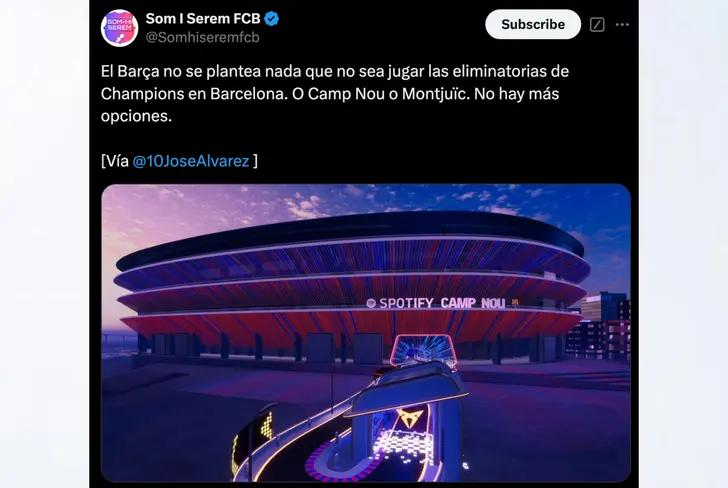 FC Barcelona tomó la decisión de no jugar en el Estadio Cornellà los partidos de Eliminatorias que le quedan en Champions League. De acuerdo a información de José Álvarez, solo irán al Camp Nou o Montjuic, pero el del Espanyol está totalmente descartado. Ya que el escenario deportivo primero está descartado, se mantendrán en el que hacer de local desde el año pasado.