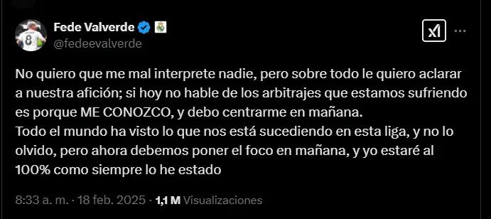 A través de sus redes sociales, Valverde ha publicado un mensaje dirigido a la afición del Real Madrid en el que ha querido aclarar sus declaraciones. El uruguayo ha reconocido que la situación arbitral es complicada, pero ha enfatizado que su principal objetivo es centrarse en los próximos partidos y ayudar al equipo a conseguir los objetivos marcados.