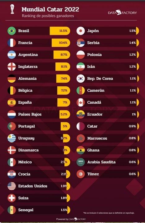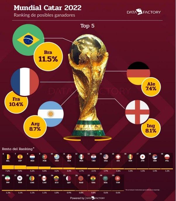Cada vez falta menos para el pitazo inicial de la Copa del Mundo, la competencia más esperada por los amantes del fútbol, y según DataFactory, Brasil es el favorito para quedarse con la Copa con un 11,5% de probabilidades.