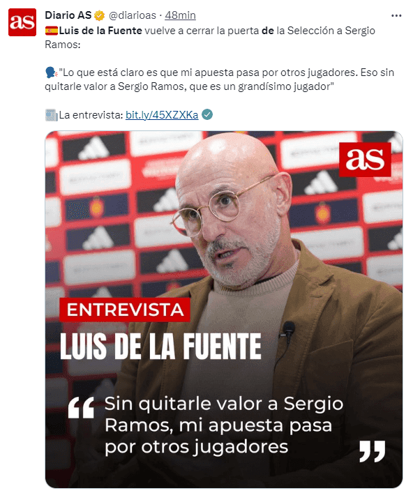 Muy a su estilo se le ha criticado al entrenador por las dudas que se pueden suscitar alrededor del llamado de algunos de los históricos a esta convocatoria, a lo cual Luis De La Fuente dio detalles sobre lo que pueda pasar en los próximos días dejando un nuevo mensaje a Ramos: "Lo que está claro es que solamente con ver cómo se han ido desarrollando los acontecimientos demuestra que mi apuesta pasa por otros jugadores. Eso sin quitarle valor a Sergio Ramos, que es un grandísimo jugador. Pero un seleccionador tiene que empezar con una idea basada en algo y yo tengo una serie de jugadores que me dan garantías y confianza".