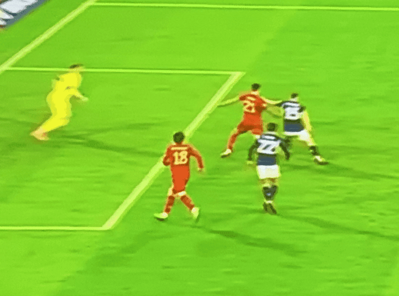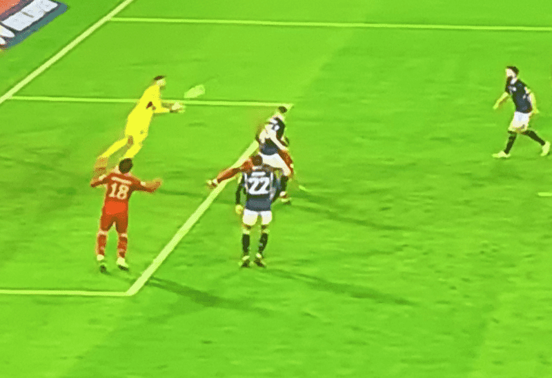 Joselu ya le había ganado la posición en la marca al defensor de Escocia que no tuvo otro remedio que tomarlo de la camiseta y esto le impidió que llegara limpio al esférico para cabecear. De ese modo, el delantero se sintió con el derecho de reclamar ante la falta que le hicieron, sin embargo el árbitro le hizo caso omiso.