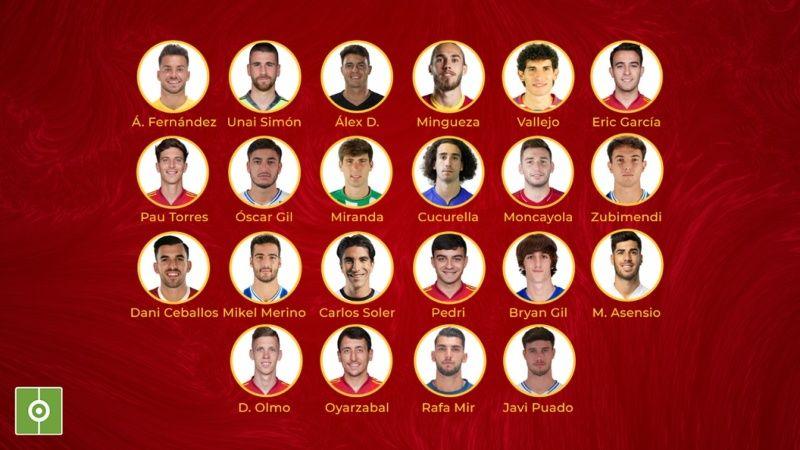 Según informa sport.es, la lista final de convocados de la Selección de Fútbol de España quedó conformada por: Álvaro Fernández (Huesca), Unai Simón (Athletic), Iván Villar (Celta de Vigo), Óscar Mingueza (Barcelona), Jesús Vallejo (Granada), Eric García (Barcelona), Pau Torres (Villarreal), Óscar Gil (Espanyol), Juan Miranda (Betis), Marc Cucurella (Getafe), Jon Moncayola (Osasuna), Martín Zubimendi (Real Sociedad), Dani Ceballos (Real Madrid), Mikel Merino (Real Sociedad), Carlos Soler (Valencia), Pedri (Barcelona), Bryan Gil (Sevilla), Marco Asensio (Real Madrid), Dani Olmo (RB Leipzig), Mikel Oyarzabal (Real Sociedad), Rafa Mir (Wolverhampton) y Javi Puado (Espanyol).