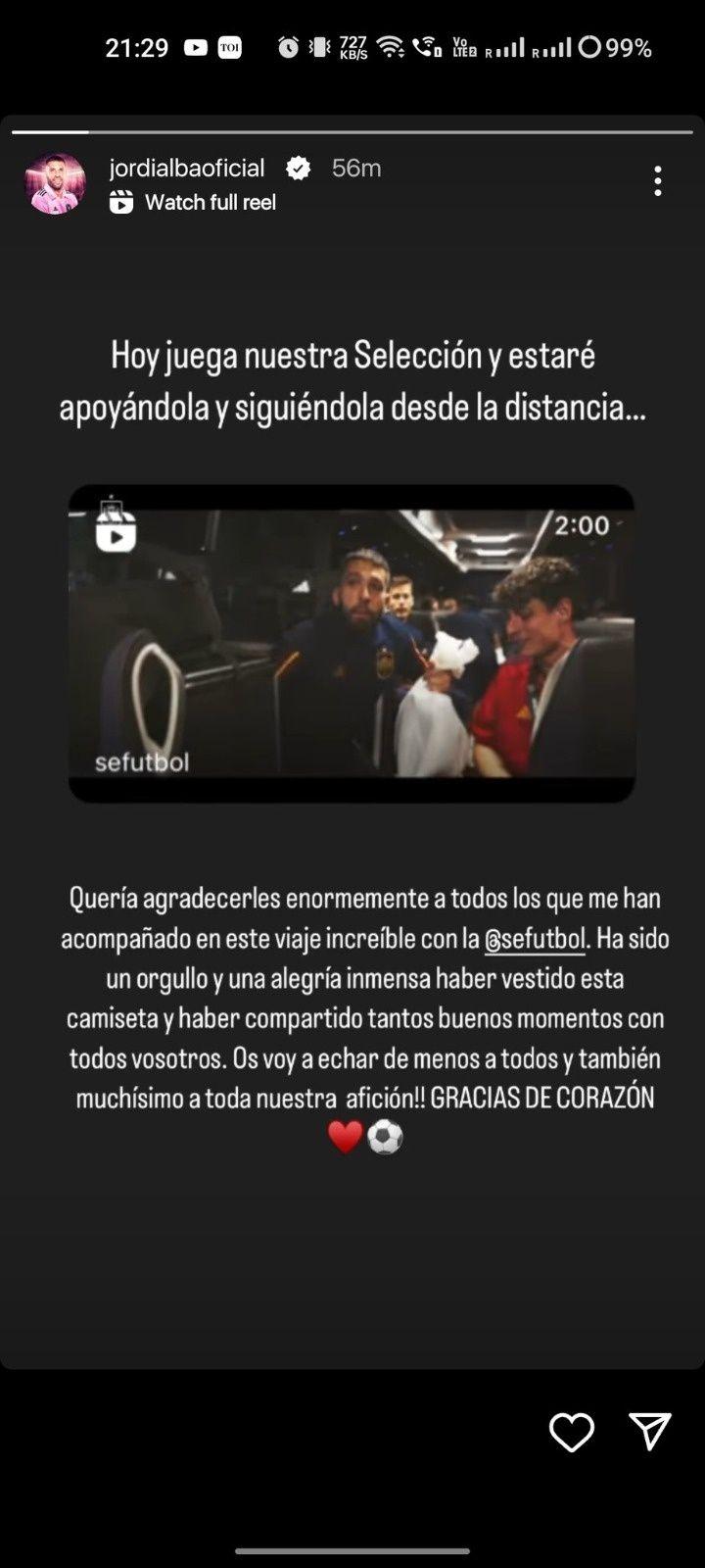 "Quiero agradecerles a todos los que me han acompañado en este increíble viaje con la Selección de España. Ha sido un honor y una alegría inmensa haber vestido esta camiseta y haber compartido tantos buenos momentos con vosotros. Os voy a echar de menos a todos, principalmente a nuestra afición, posteó Jordi Alba.