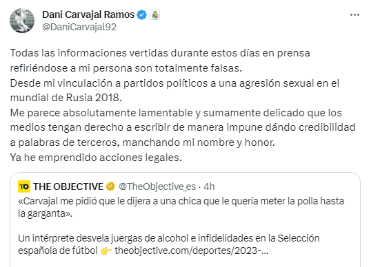 Ante la viralización de este video, Dani Carvajal, se descargó en Twitter donde escribió, muy enojado, lo siguiente: “Todas las informaciones vertidas durante estos días en prensa refiriéndose a mi persona son totalmente falsas. Desde mi vinculación a partidos políticos a una agresión sexual en el mundial de Rusia 2018. Me parece absolutamente lamentable y sumamente delicado que los medios tengan derecho a escribir de manera impune dando credibilidad a palabras de terceros, manchando mi nombre y honor. Ya he emprendido acciones legales”.